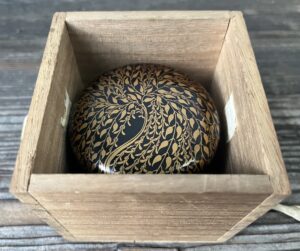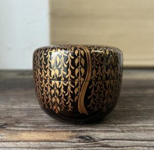 鹿皮紐のつけられた箱の蓋表「柳桜蒔絵棗」の墨書きは、