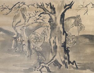 木の下の三頭の馬の足元から、這いつくばって喧嘩をうかがう男がいますね。