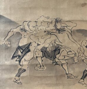 上半身裸で頬かむりした男と鉢巻きした男が目を三角にして掴み合い、