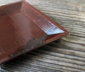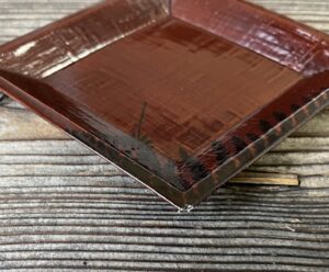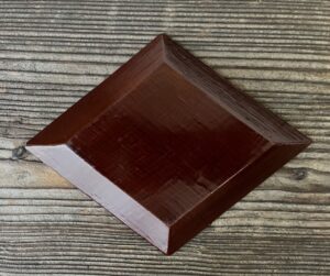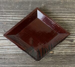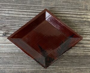 薄く削った木胎で菱型の皿を作り、布を着せて漆を塗っています。