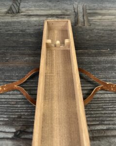 鹿革の紐は二股に切られて固定され、細長い箱を安定して結べるようになっています。