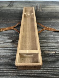 鹿革の紐は二股に切られて固定され、細長い箱を安定して結べるようになっています。